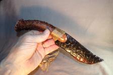 This beautiful and very unique knife is 10 3/4 inches long measured straight and this nice blade has been knapped out of a nice midnight lace and red obsidian. This handle is a very nice black tail deer antler. This is such a nice knife and would certainly stand out in any knife or flint knapping collection. The blade has been hafted to the antler handle with resins and artificial sinews and a paw print is painted on the butt of the handle.