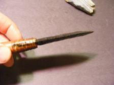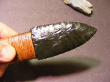 Here is a nice little knife I percussion knapped from Dacite, which is a little tougher than obsidian,,, The blade is set into a Red Cedar hand carved handle using epoxy and lashed with real deer sinew ,,, the knife is sharp and functional........ Priority shipping and insurance included in the price. |