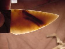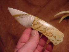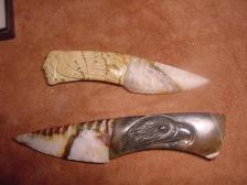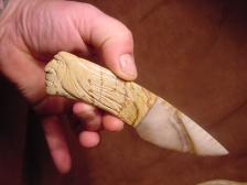 "SPIRIT HUNTER " Here is a Rare opportuntiy to own Dale Cannon ~Bonecarver combo stone knife , The knife itself was made by Dale Cannon and I took over from there and carved a Indian hunter spirit flowing from the end of the handle back towards the blade, he has a determinded look in his eye's and face. The handle of the knife is Picasso marble and the blade is made from Paiute agate , A perfect match in color and form. His trademark symbol is diamond scribed on the blade. This knife comes with a certificate of authenticity signed by both Dale and I