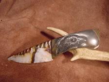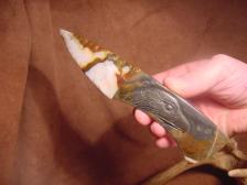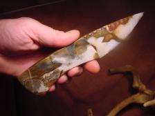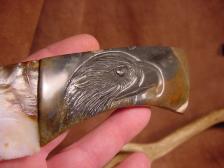 Here is another knife offered with comined efforts of Dale Cannon and I. dale made the knife and I carved the Eagle on the stone handle. The handle is made from Picasso marble and the blade from piaute agate....If you do not know who Dale is ? he is a knapper / lapidary artist from