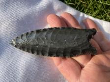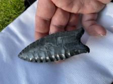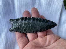 Sweet Dalton made from glossy silver sheen obsidian with contrasting bands of gray and black. Hafting area is ground. Thanks for looking! |
