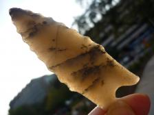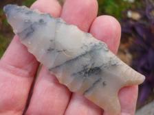A nice serrated Dalton by master flint knapper, Bob Thomas. It was knapped from a really nice, translucent piece of Novaculite, that contains black markings. Knapped 1998 – 2003. |