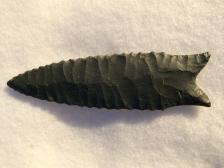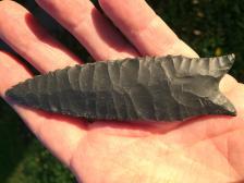 A nice serrated Dalton out of black Arkansas Novaculite, by master flint knapper, Bob Thomas. Nicely done. Knapped Sept, 2001. |