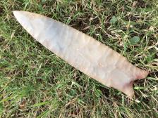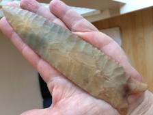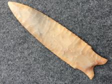 A gorgeous, long Bob Thomas Dalton. Knapped from Arkansas Novaculite. Colors are light orange, dark gray, and pinks. Bob is a well-known, master flint knapper. Knapped Mar, 1998 |