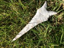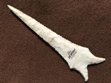 Nicely made serrated Dalton Drill by well-known flint knapper, Jim Redfearn. The drill is light gray with brown accents and made from Ohio Flint Ridge. Knapped at the Ft Osage Knap-in, May, 2002. Signed and dated: Jim REDFEARN 5-17-02 |
