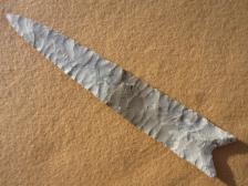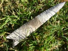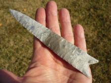 Collectible Dalton point. Featured in 2012 Flintknapping Calendar, month of Oct. This light gray with dark gray, Dalton is made from Boone chert from Oklahoma. Jim Spears, a master flint knapper from Missouri, knapped this point May, 1999. |