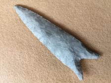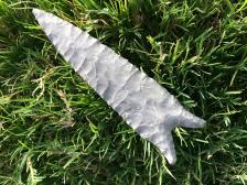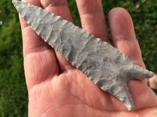 An awesome replica of a Dalton, made by well-known abo knapper, Jim Spears. This awesome Dalton is made from gray Reeds Spring chert, from Missouri. Knapped May, 1999. Inv # 9905-3R |