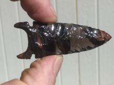 The deeply concave base gives a stark outline to this point. The obsidian has clear, black, and reddish layers. Nicely tapered and flaked. |