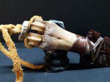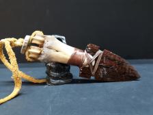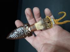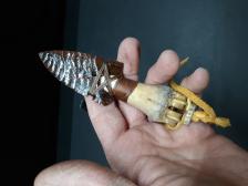 This is a sweet little knife that i made using a deer legbone knuckle and a peice of high quality Glass Buttes Mahogany. This peice comes together well in an ensemble of ancient meets modern. The blade is hafted arrowhead style into the legbone and sinew wrapped with cross laceing. For finishing touches i cut a leather string and fed it through the handle and a handmade antler bead then tied secure.