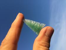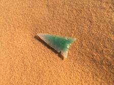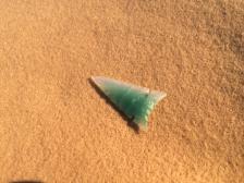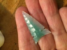 Translucent India Jasper gem point, knapped by Ron Fuller, one of the great, senior flint knappers. Ron was known for his beautiful parallel flaked gem points out of exotic material. This Desert Side Notch was knapped from green and white India Jasper. Knapped Mar, 2001. Inv # 0103-120R. Signed: RAF 01 |