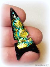 The colors really POP out! The deep rich glow on these arrowheads reminds me of precious opal, but with that added sparkle. I hand craft each piece of glass before flintknapping it into art work that is frame-able (for collectors) or wear-able (as a necklace pendant ... the edges have been dulled). Normally artists would sell the piece of unknapped glass blank for about $45.00, but I'm able to reduce the price by creating the glass blanks myself and pass along the savings to you. This arrowhead is reversible also (a deep rich mottled color on one side and a glassy obsidian-like look to the other side).