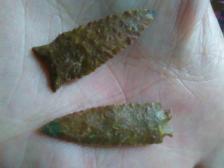 I knapped these 2 arrowheads out of rarely seen dinosaur bone from mcelmo canyon Colorado. Each point has a green tip.very rare variety of dinosaur bone. Thanks for your time and have a good day. Both come with its own coa. |