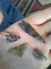 I knapped the bird out of fossil dinosaur bone from mcelmo canyon Colorado and the little cornertang out of spiderweb bone from mcelmo canyon Colorado and the scat all from mcelmo, and an oddball point of Montana agate.all 3 fossil points come with coa of their own. Thanks for your time and have a good day. |