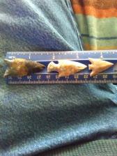 I knapped the Dalton out of rare fossil wood from mcelmo canyon Colorado and the Cody knife style out of anasazi agate,and the sharp little corner notch out of gem dinosaur bone also from mcelmo canyon Colorado. Thanks for your time and have a good day. |