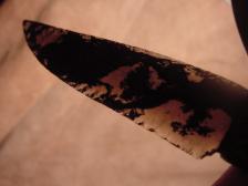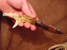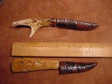 Offered here and straight off my work bench is a double headed eagle carved stone knife where I carved a open mouth and a closed mouth eagle on the forked tine of a antler and hafted it to another Ken Hull blade, this one is tri flow mahogany obsidian and flows perfectly with the handle. I carved a saw tooth design for the transition to the blade, The blade is signed by Ken and the handle is signed bonecarver and numbered.