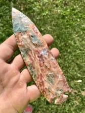 This is an exceptional piece of famous Roy Millers “green” Flint ridge! I struggled to keep the width and length out of the thicker square edged pre form and sacrificed a “cleaner” quality knapped blade. Nonetheless this piece makes a statement of beauty that will POP in any case and looks amazing!! |