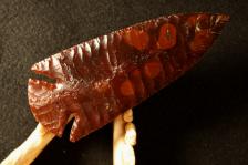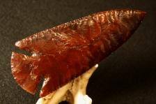 This stunning Dovetail is knapping from a large piece of beautiful, dark red carnelian agte with red blood drops scattered thoughout the point. This is a large point with very deep notches. A vey, very nice point. |