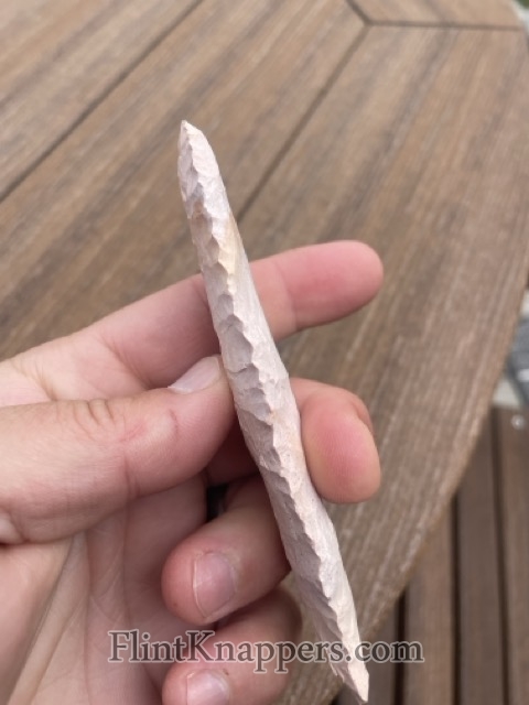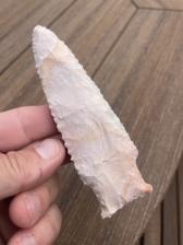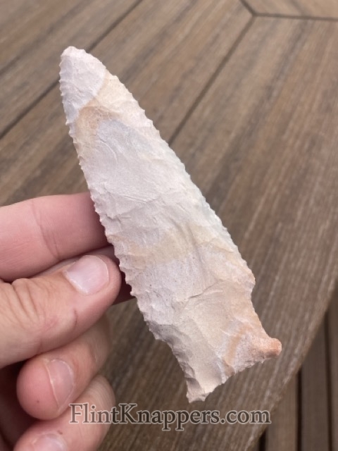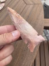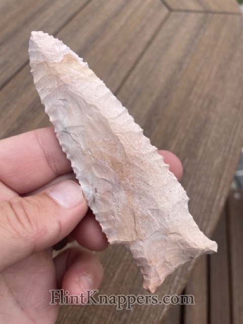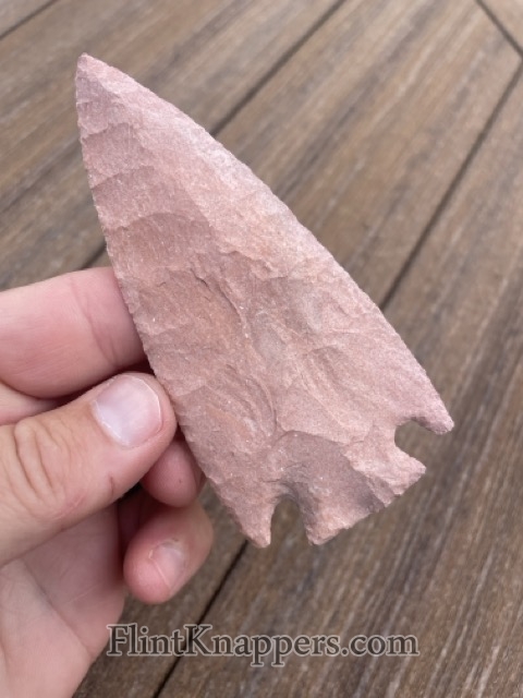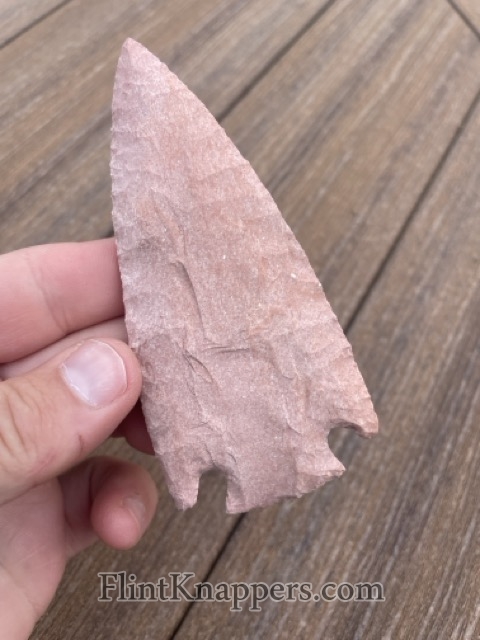 A beautiful heat-treated, Burlington Dovetail arrowhead. This point is extremely well-balanced. Broad percussion scars along with fine secondary flaking.