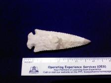 Material is heat treated Burlington Chert. It has white and pink coloring, and the point is serrated and beveled. |