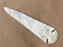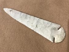 A nice long Dovetail out of Burlington, by well-known flint knapper, Jeff Gower. Jeff is one of the best commercial flint knappers in the U.S., meaning he made a living at flint knapping, and maybe still does. It’s a nice replica and was knapped over 20 years ago. The color is cream. We purchased the Dovetail from Jeff at the White River Knap-in, Oct 1997. Knapped Oct, 1997. Inv # 9710-211R |