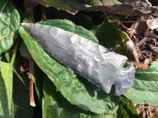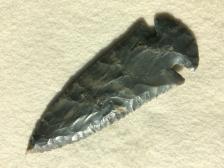A gorgeous Dovetail, knapped by the late Joe Price, one of the early flint knappers and well known. The Dovetail is double beveled and made from dark gray, with light gray bullseye markings, Indiana Hornstone. A beautiful point. Knapped June, 2002. |