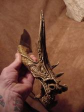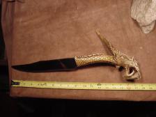 It takes another dragon to kill a dragon, This knife will certainly do the job as I carved a mythalogical dragon from a non typical antler, The dragon is very detailed and is one solid piece of antler , THe frilles I carved to twist in all directions, spines,scales,fangs, even inside the mouth around the fangs and tongue are carved with deatil and form. the blade for the knife I ground and shaped and polished from a slab of midnight lace obisidian, I had the material for almost 10 years...waiting for a perfect blade....The blade fits to form perfectly as the transition from the handle to the blade flow together,inside the blade is where the beauty of the obsidian i placed so the unique pattern inside the stone take shape and form othe the dragons tail, cobb web inclusions set the atmosphere for the battle and this is ready to fight the evelest of dragons.