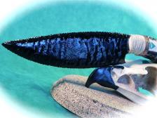 Some awesome curves on the blade of this custom collector’s knife! Antique black carrara glass is expertly knapped, & is glossy & sharp. A choice piece of Axis deer antler has been dyed & hafted to the blade. Tight & strong is the joint, & all is glued & wrapped in hemp. The haft area is also onlaid with a copper ring of Southwestern motifs, & turquoise. On the butt end I carved a bear claw & inlaid a nice cabochon or turquoise. All is buffed to perfection & ready for display. A big knife with a nice form, & comfortable in the hand. I fashioned the stand from texture-painted wood & an awesome – life size eagle skull replica. Close-up photos are provided to show off the detail work! (Knife is 10 ½” long). Quite a show piece! Please include $14.00 for shipping & insurance. |