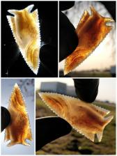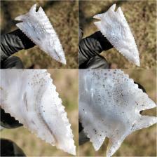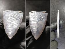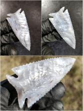 Nice Eared Corner Notch, clean flaking, regular surface, lean and mean. In a great piece of Indian Blue Agate, with excellent bands and Dendrites! One thing I really like about this agate is that some of it exhibits a strong opalite-like light refraction when turned in the light, and this piece here displays it well! Really hard to capture on camera, but trust me, it's apparent in person!