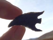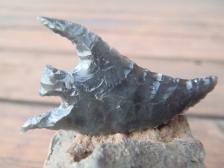 It's small at 1.5 inches, and its quirky shape is quite unique. Pressure-flaked from a piece of graphite-colored obsidian. It's one-of-a-kind. |