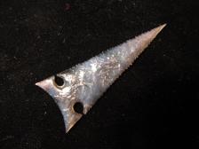 This Shasta style obsidian point is made out of an old piece of Davis Creek CA rainbow called 'electric blue'. Not much of this lavender and blue sheen rainbow is around anymore. This one is based on real points I've seen from Southern Oregon and Northern California. They're not quite a Wintu point but are sort of first cousins. Key hole round expanding notches and fine serrations.I tried to get the blue sheen best I could in artificial light but its brighter than it appears in the pics. |