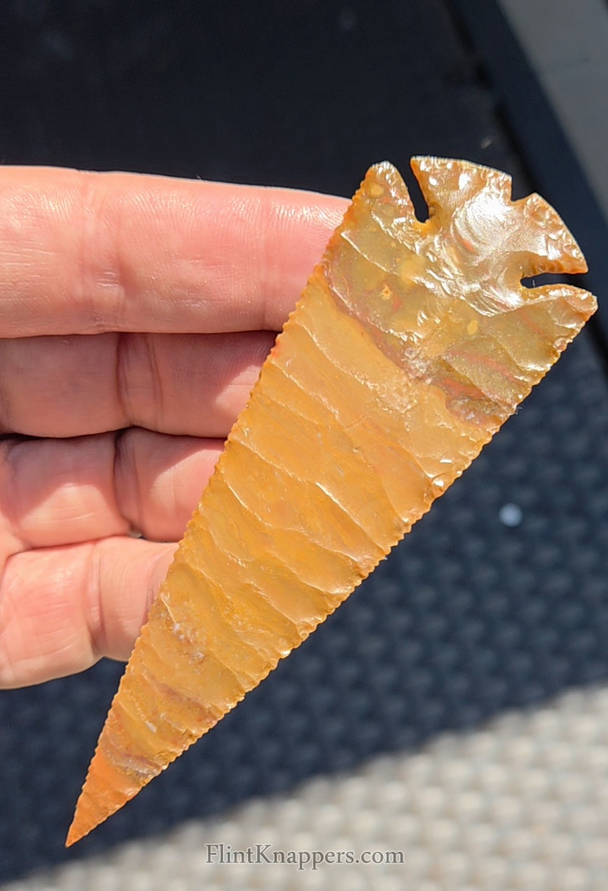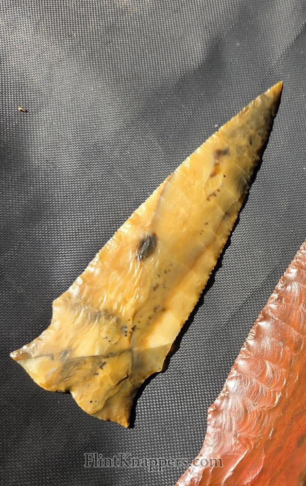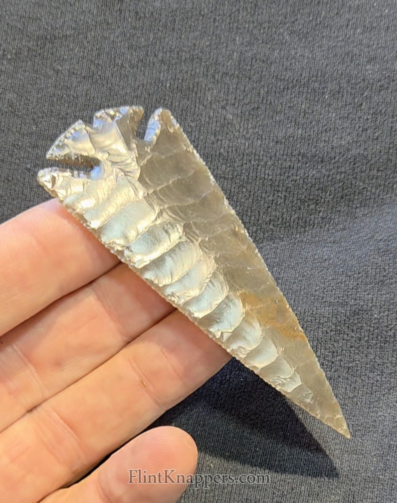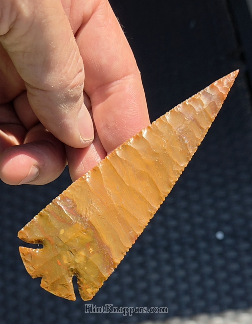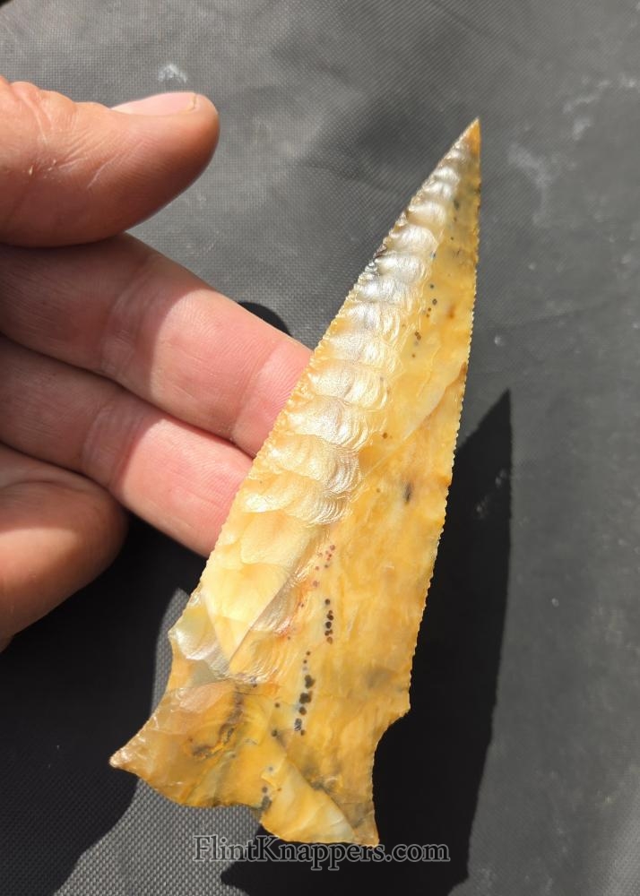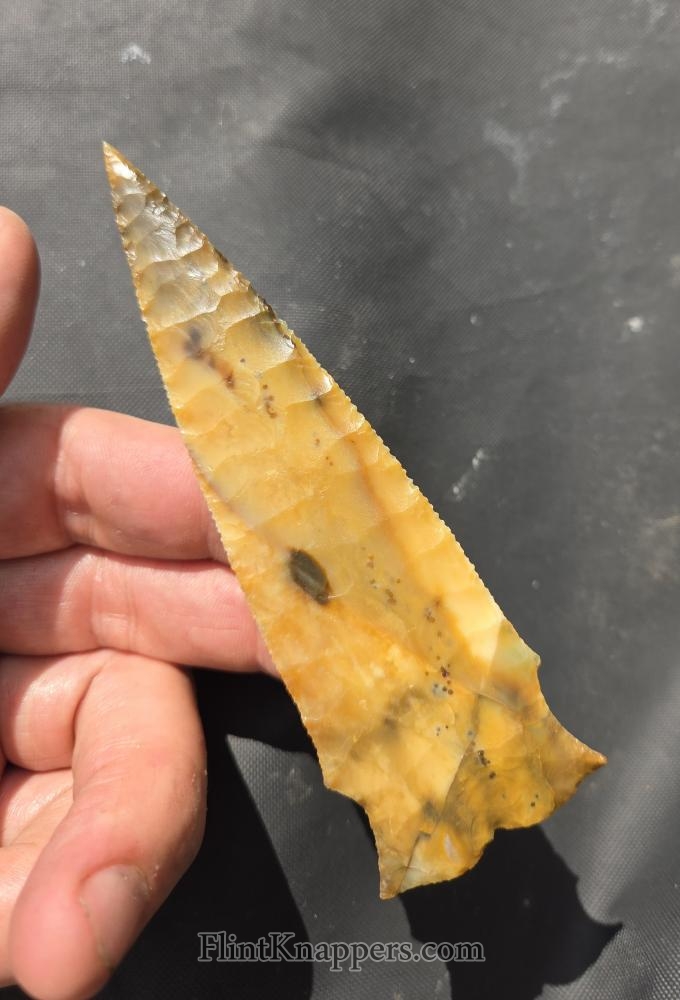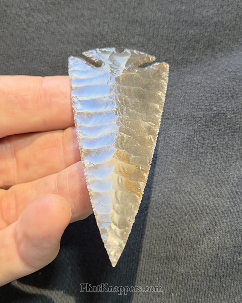 Here is a super nice Elko made from English flint. Very symmetrical flake patterns, deep notches and super thin edges make this a real smoker. Thanks for viewing |