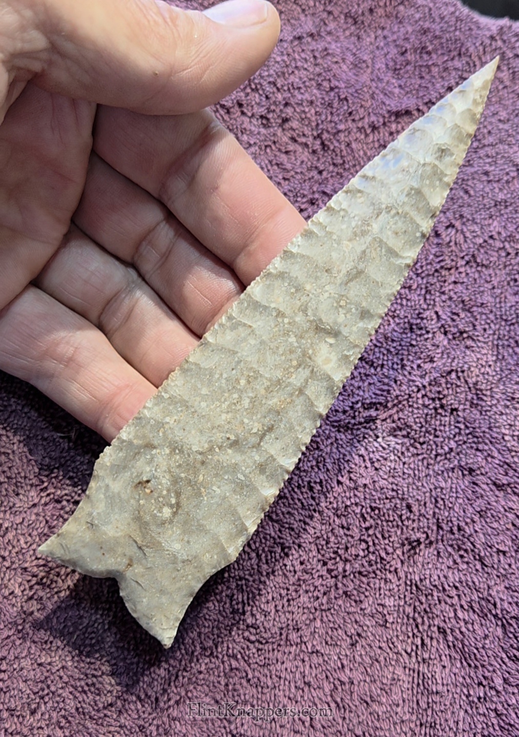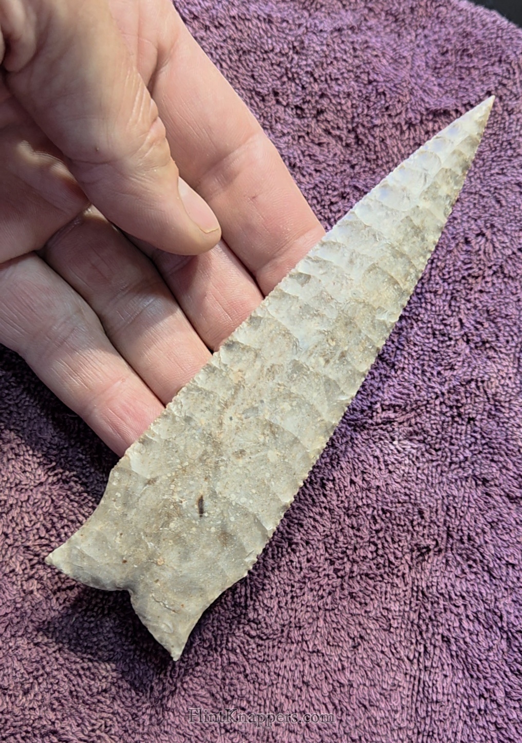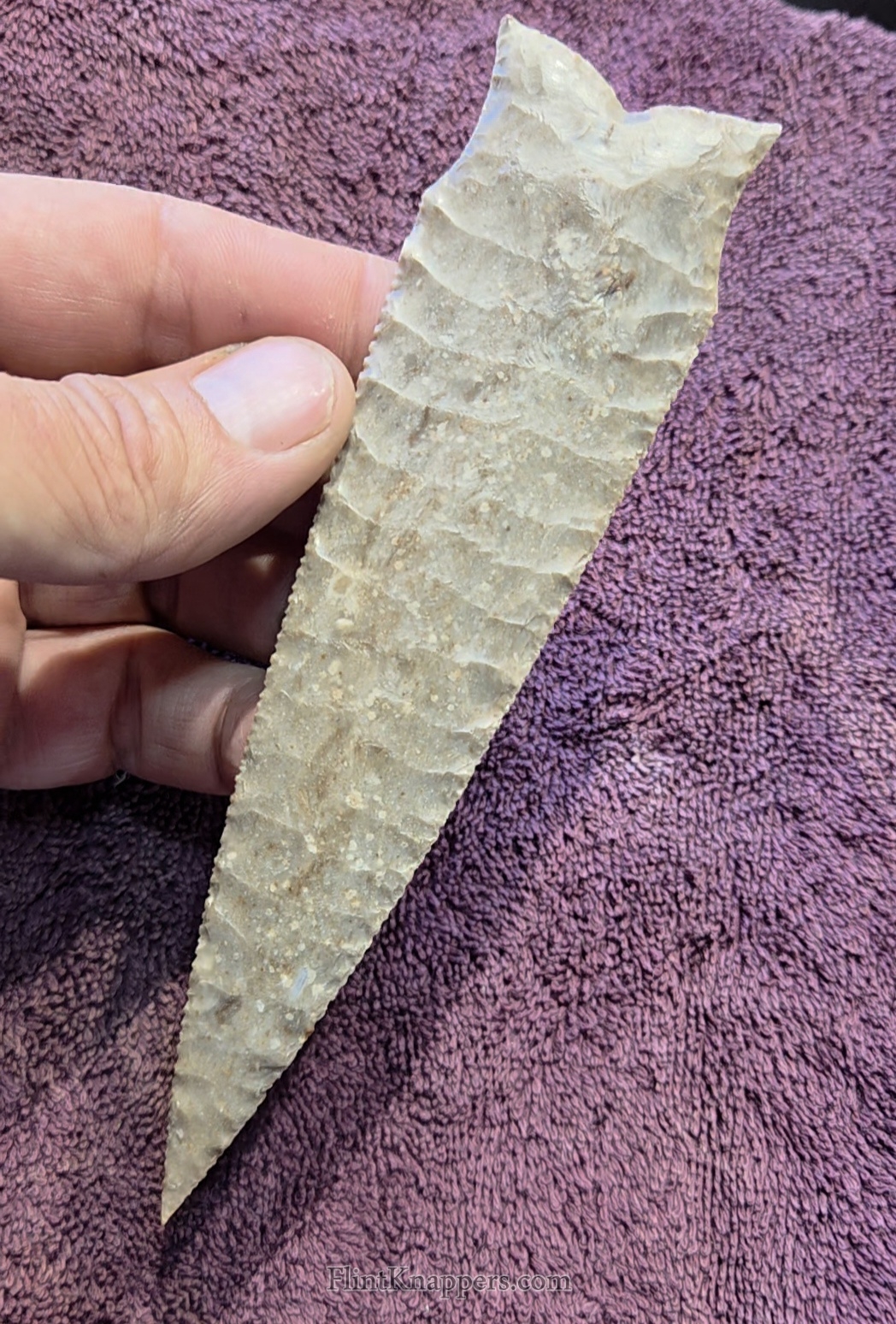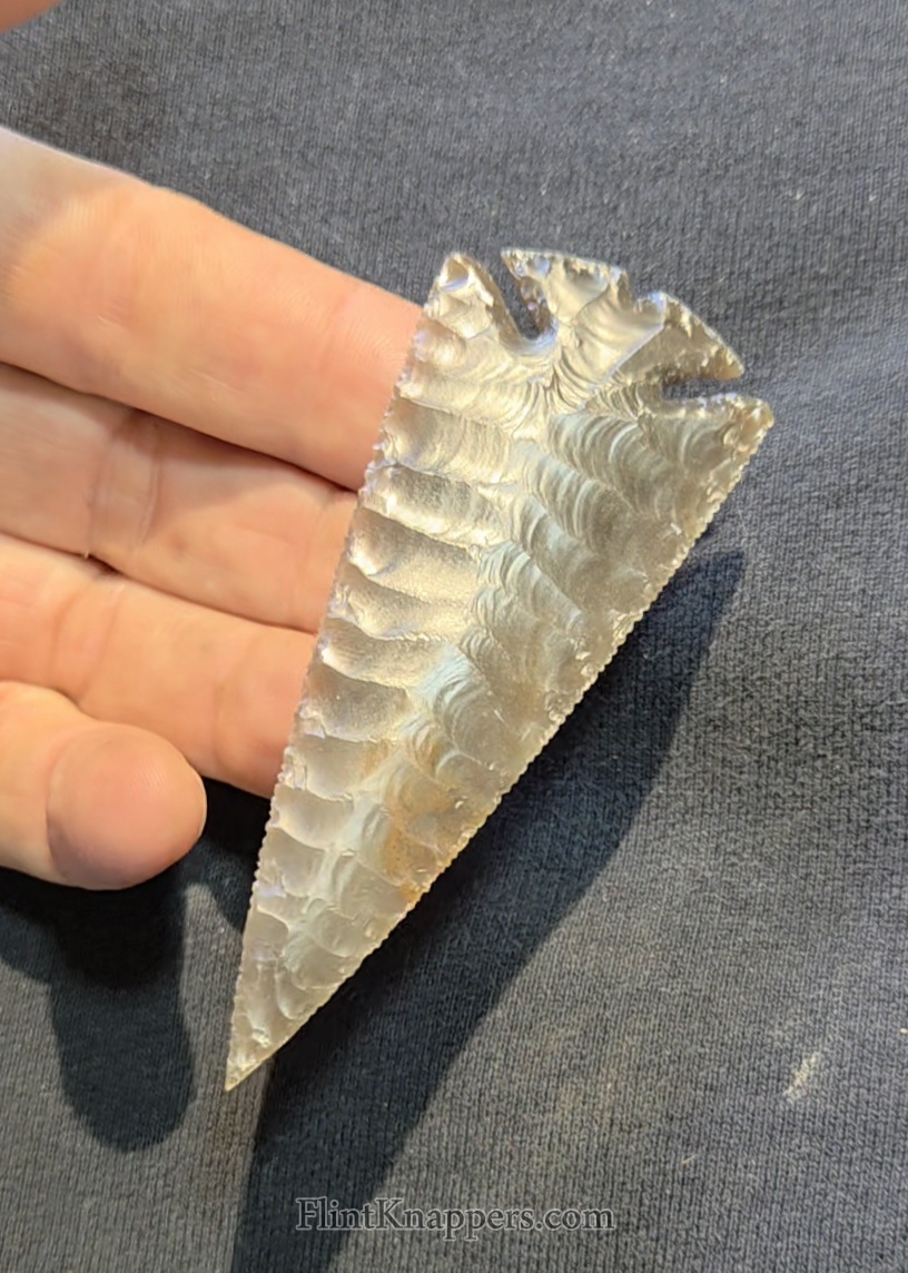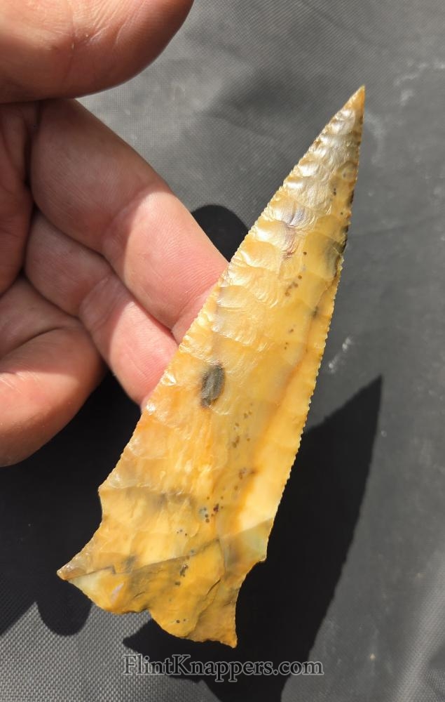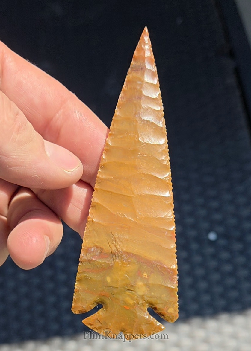 Here is a super nice Elko made from English flint. Very symmetrical flake patterns, deep notches and super thin edges make this a real smoker. Thanks for viewing |