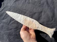 This may be the longest type 4 dagger I’ve made. Made from keokuk chert. This dagger was knapped with the same tools as we believe the originals were made. Hammer stone and antler percussion, antler punchwork to create thickness in the handle before the use of a copper punch to created the primary punch stitching them finished with copper pressure. All the edge prep was done with hammer stones. I did my best to copy the order of resection that we believe was used based on the couple of unfinished daggers that have been found. |