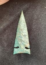 Very thin Ishi style point made from mostly green fancy jasper. |