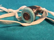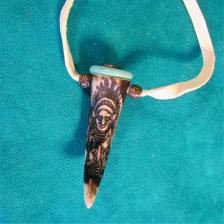 This is a very unique piece of rustic jewelry – suitable for guy or gal. Centering this piece is a faux-bone tooth or antler tip – embossed with a Native American chief, in full regalia. I’ve customized it with turquoise & an antique copper Indian head mini coin. I then drilled it out & added a soft deer leather lanyard with matching beads. Quite nice and one-of-a-kind! The pendant is 2 1 /2” high. (Please add $5.00 for shipping & insurance to anywhere in the U.S.). Thanx for looking! |