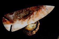 This is a beautiful piece of feathered Snake River Agate. This spear point has deeply narrowed notches and detailed edging. It is a classic point. Photos don't do this one justice. |