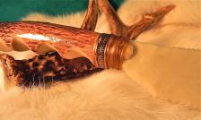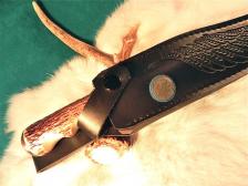 A nice gift idea for that “hard-to-buy-for” person! This big Frontier knife combines with a decorated sheath. This Bowie style knife is made from a choice piece of Elk antler – with much shop time put into the finger grips. The butt is nicely decorated with a copper buffalo-head concho – with nickel & copper spacers. A copper band also adorns the bolster area of the handle. The long beige blade is antique carrara glass and is chipped to near perfection. In case you want to take this one down the road, it comes nestled in a belt sheath with a wing pattern, buffalo nickel, & a beaded leather tassel. Knife is a big 10 ½” long. ($8.00 additional will be needed for shipping & insurance). The copper tones & natural materials blend very nicely together…..**NOTICE: WHILE SHARP & BUILT TO LAST….MY CREATIONS ARE FOR COLLECTING PURPOSES & NOT FOR HARD USE! |