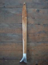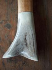 made of highly figured clear birch and caribou antler, this thrower combines smoothness and accuracy with pure raw power. the main body has just the right amount of flex and the antler handle provides balance and a secure grip. at 27'' it will handle darts from 6' on up with ease. a perfect atlatl for hunting large game. |