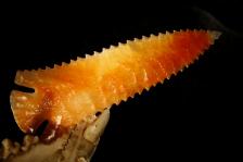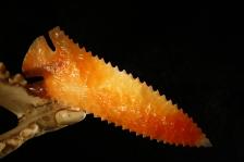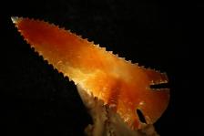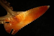 A stunning piece of flaming Piranha Agate. This is one of my signature "Points Of No Return" known for the reversed serrations. A collector's dream. |