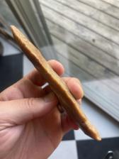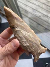 A heat-treated Flint River Hardin. Some very fine flaking along the blade edge. This variety of chert has all sorts of color variations and has a nice, waxy appearance and feel to the rock.