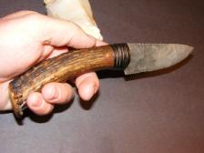 Here is another one of a kind piece created in the hills of WV,,, This is a combo set of knife and case, the blade was knapped from Georgetown flint then hafted into a Mule deer antler handle using a two part epoxy then wrapped with real deer sinew,,, the case was hand stitched by me from Moose antler........ Free shipping |