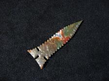 Great color in this Flint Ridge Cahokia point. Dark green with red ,white and blue swirled in. Fine little point! |