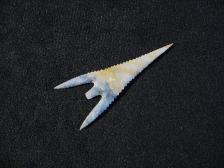 Excellent Gunther point made from Ohio Flint Ridge material. This one has the hard to find mix of yellow and blue color. Long barbs, finely flaked and delicate. |
