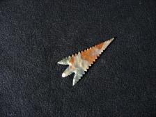 Standard little Gunther type arrow point knapped from Flint Ridge material. Kind of a greenish/grey with unique red blotches in it. |