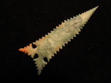 This nice thin Cahokia point is the Mound 72 variety and fully serrated with expanding notches. Its thin and is a pretty greenish blue color with a bit of orange-tan thrown in. This one came out particularly nice |
