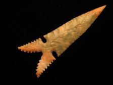The Tribute point this one is modeled after came out of the famous Oklahoma Spiro mound, out of what was called the 'Craig mound in the Spiro mound complex, excavated in 1933 if I got my facts right. Its made out of a colorful piece of Ohio flint ridge that is pale mottled green with an orange tip and white and orange tinged base. Its quite thin since it was made from a thin flake to begin with. These points vary and there were other sub types found in the mound as well. This one is bigger than the well known Pete Bostrom (Lithics Casting Labs) cast of an original but I wanted to leave it longer to keep the orange tip on it. The digital pic doesn't show the green color as bright as it actually is but you get the idea. Not made one of these in quite a while so I figured, its time. |