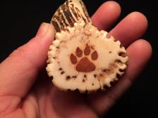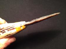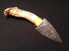 Georgtown flint on an antler handle. There is a paw print carved into the end with Oklahoma red clay inlay. The handle has been coated in lacquer to protect it and make it easier to clean should you use it. And it would get the job done.