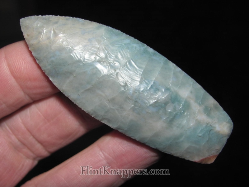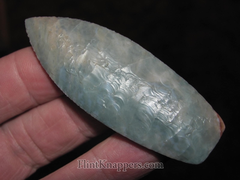 Up for sale is a well-made 2 7/8" Agate Basin by Phil Love, crafted from high-quality blue Flintridge Flint. The material shows attractive color and light translucency. Workmanship is clean and controlled with even flaking and strong symmetry. Classic, well-balanced form with a nicely finished base. |