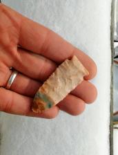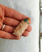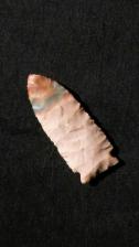 Beautiful Tan,Red,Pink,Brown,Green and a little Blue Flintridge with some small quartz inclusions throughout the point. Most of these type of points I see and find are the Blue/Black Coshocton but every once in a while there's a Flintridge one that pops up. Thay are always thin high quality flint small serrations shallow notched and ground base just like this replica. Chipped with bone and antler. |