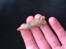 Glossy translucent Flintridge Grey and Caramel with a Blood Red lines and swirls and a couple Blue/Purple splotches on the point. Really pretty point.